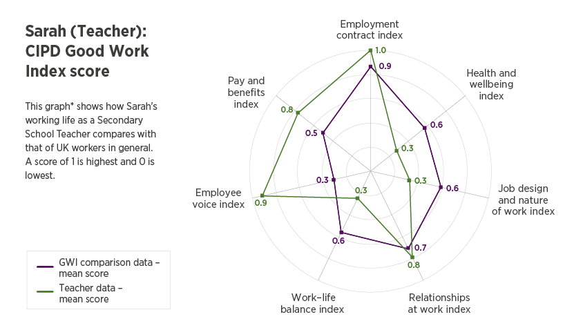 *This graph shows Sarah’s score alongside the UK mean (average) for the 7 dimensions of the CIPD Good Work Index