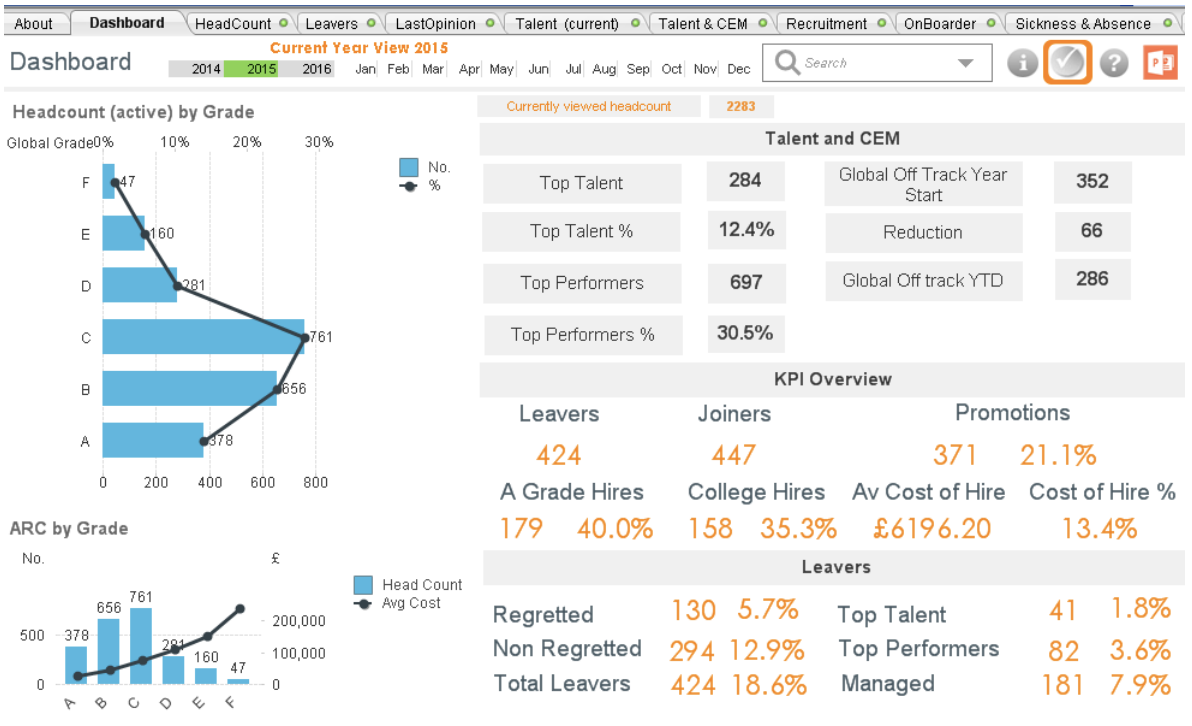 The applications were presented to the HR Leadership team and they were instantly sold on the approach. Seeing their own data presented in this new way really captured their imagination and they agreed to invest in further development of the tool. The aim was defined; to build one application covering all key HR areas; Headcount, Talent Management, Attrition, Career & Employability, Recruitment, Sickness & Absence and L&D.