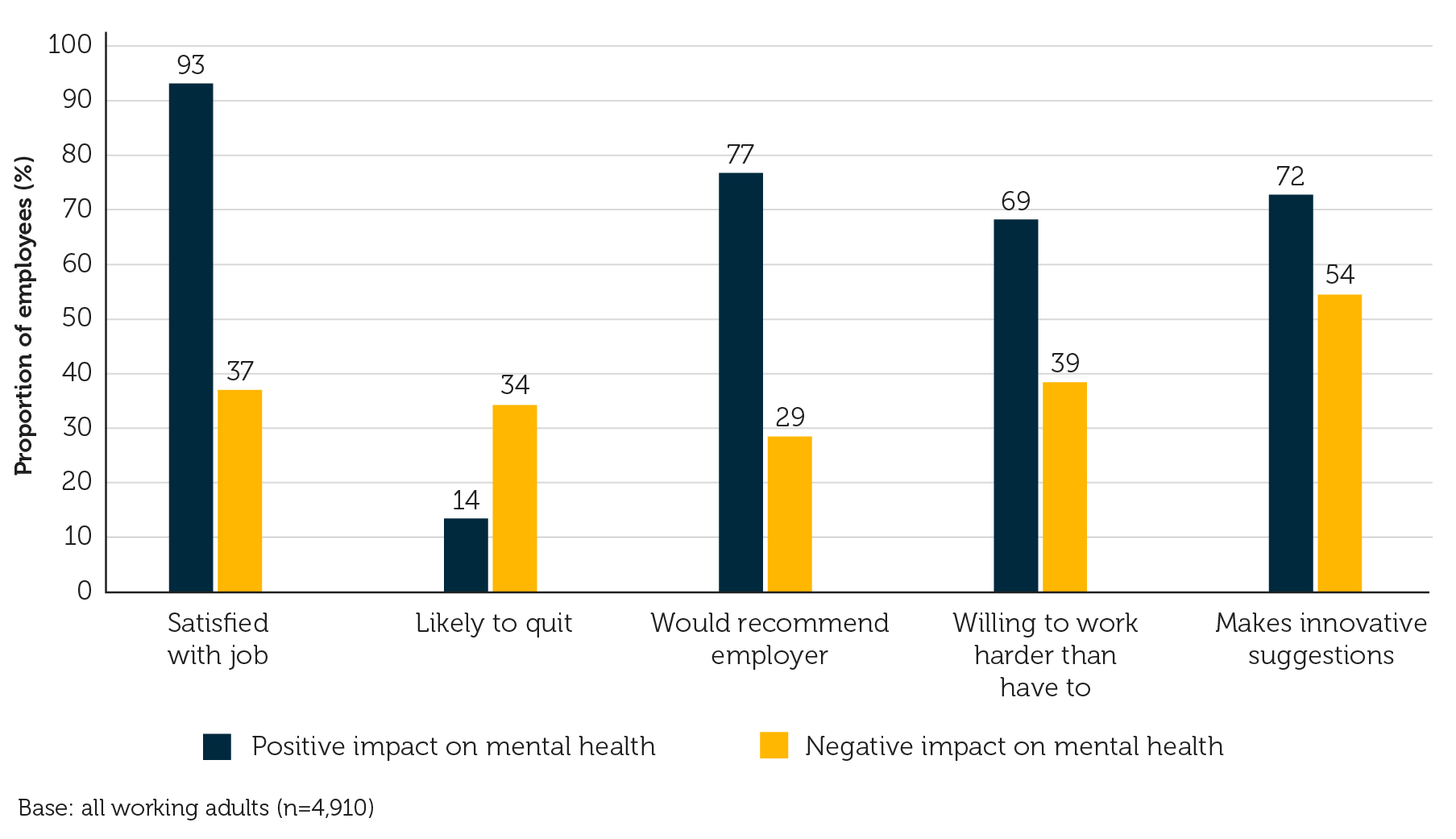 • Those whose work affects their mental health negatively are more likely to quit, less likely to recommend their employer, and have lower job satisfaction.