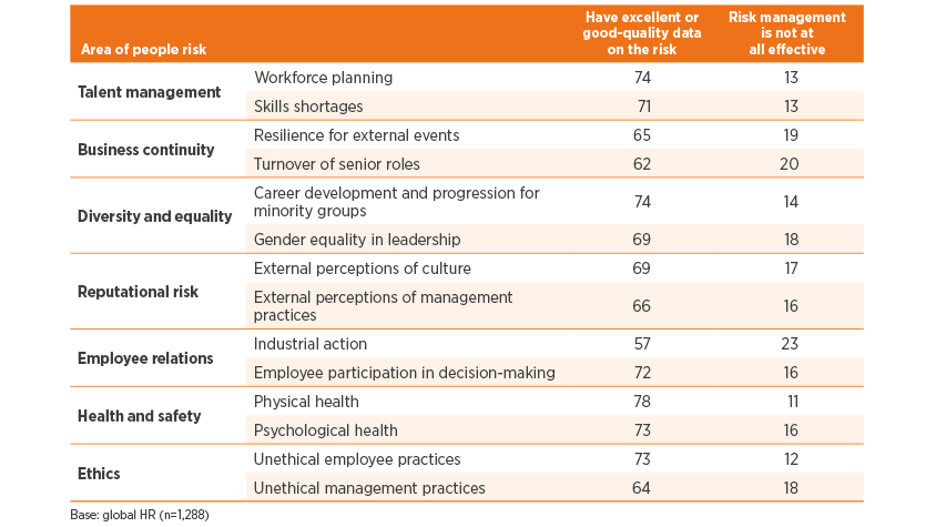 We also investigated the quality of people data available for understanding key people-related risks. We found that data quality is often highly rated, but risk management of some key people risk areas, such as turnover of senior roles, have low levels of effectiveness.