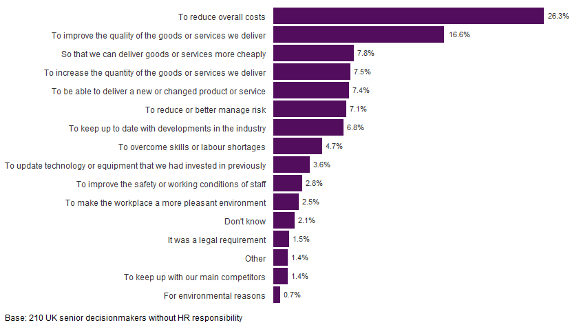 Among those who did introduce intelligent automation (Figure 4), reducing overall costs (26.3%) was by far the most cited main reason for its introduction. This was followed by improving the quality of goods and services (16.6%). In the 2018 survey, the order was reversed, with cost reduction second to quality improvement, though there was little difference between them (11.4% and 16.1% respectively). The added focus on reducing overall costs this time may have been fuelled by costly external disruptions such as the pandemic, the war in Ukraine and Brexit. This increased motivation could present opportunities for organisations that produce or implement intelligent automation solutions for other organisations.