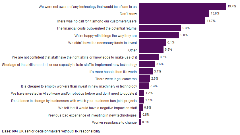 Just over half of respondents (53%) said their organisation did not introduce any intelligent automation between 2019 and 2022. The most cited reason was that they weren’t aware of any intelligent automation technologies that would be of use in their organisation (19.4%). The next most common reason was that customers or users did not ask for it (14.7%). A significant percentage of bosses didn’t know why no investments were made (15.6%). Interestingly, worker resistance to change and previous bad experiences were not among the main reasons for avoiding investment in intelligent automation (Figure 3).